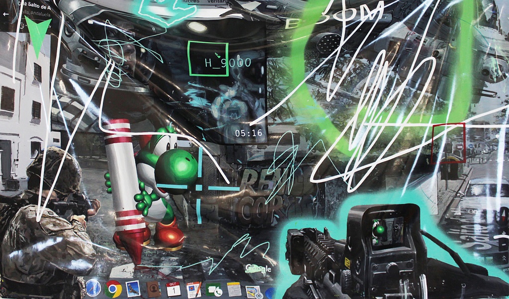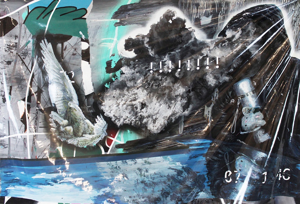 Pablo Castañeda Santana’s practice explores the intersections occurring between painting and the digital media, challenging the prevailing notions around the materiality of pictures. This awareness is expressed through the painterly interpretation of imagery appropriated from the web within the extremely flat surfaces of acrylic paint sheets that lack the traditional relief of conventional painting. His artwork are usually placed folded and contorted, highlighting their physicality in contrast to the volatile condition of their light-based digital models. The imagery represented in his paintings is created by combining edited fragments of pictures appropriated exclusively from the digital environment, encompassing an enormous range of visual references, such as videogames, documentaries, Facebook profiles, maps, advertisements, digital newspapers, Art History, etc. Santana’s series of work aims to highlight both the illusory representation of the painting as an image and the physical presentation of the paint as an object. It means to combine the painted imagery and visual strategies employed to evoke the digital environment with a new approach to the fine art materials that emerge as a response to the codified light based pictures.
